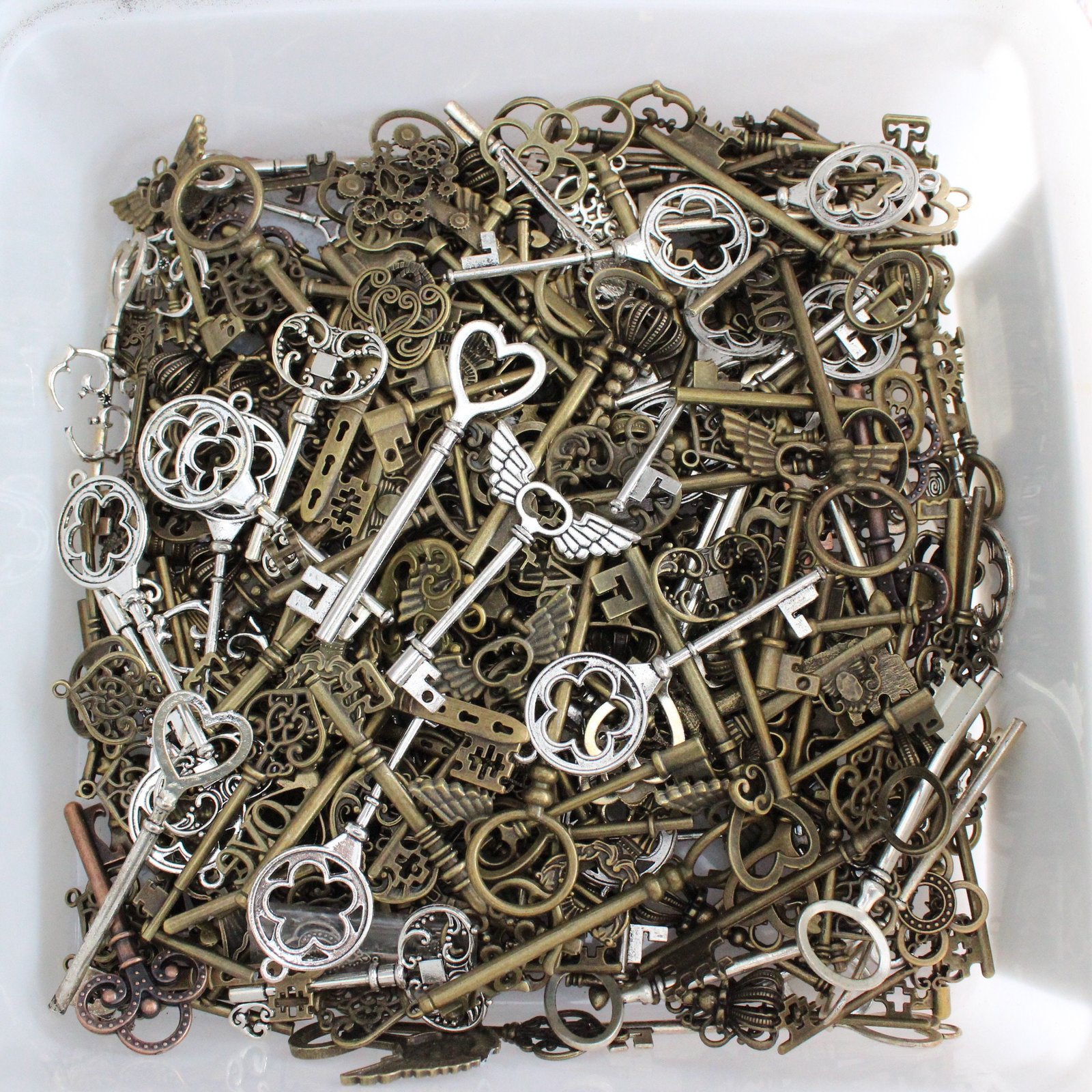 The keys come in mixed colors randomly chosen from antique silver, antique brass, and antique copper finishes. The photos provided are indicative of the 1-pound lot, showcasing the variety of sizes and colors you can expect to receive. The assortment is a delightful surprise, ensuring a diverse selection to inspire your crafting endeavors. Please note that each order will contain approximately one pound of keys in assorted sizes, providing ample options for your projects.