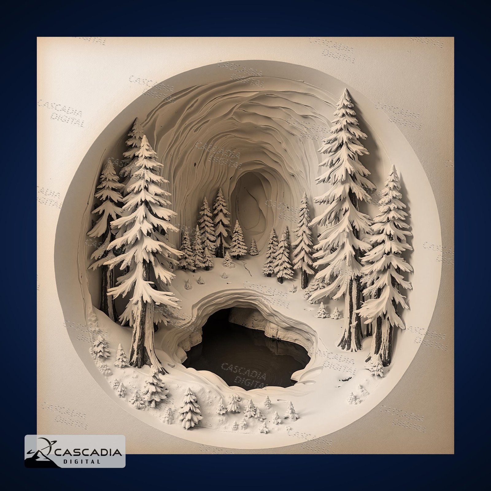 Frozen Evergreen Cave – Laser Engrave 4K PNG Image, Depth Map, Wood Slate 3D Illusion – Winter Snow Diorama Illusion 1681