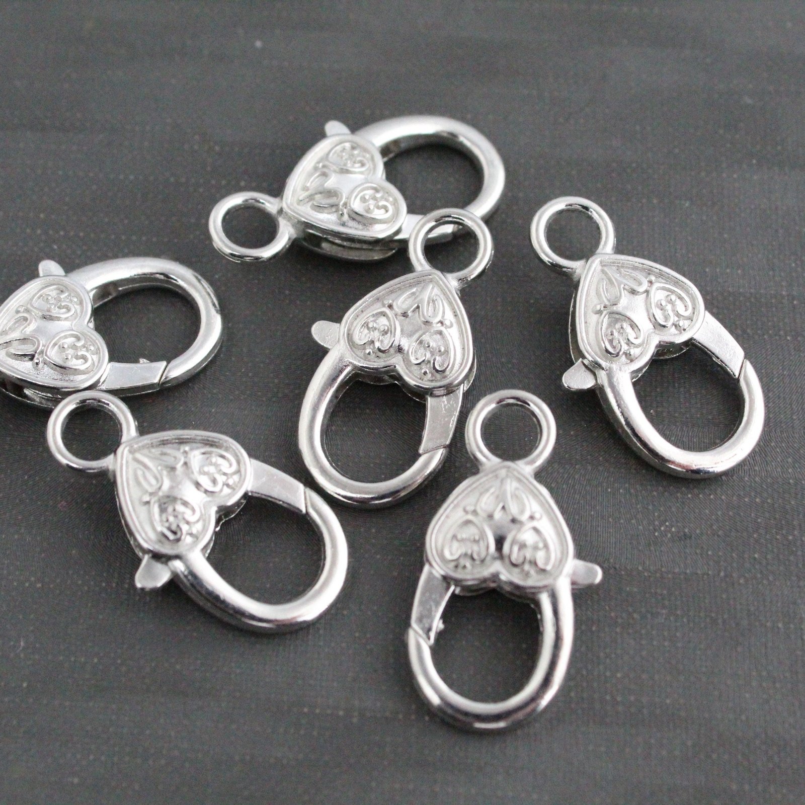 Product Description: These large heart lobster claw clasps are perfect findings for your jewelry making projects. The silver tone lobster clasps offer a sturdy closure for your designs.