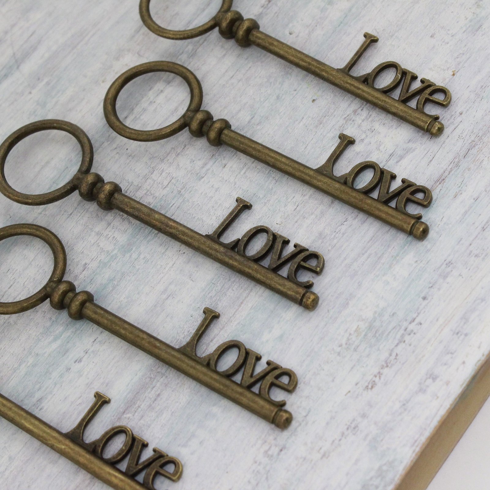 These 10 Large Love skeleton key Giant 3.25” Double sided Antique Brass Steampunk Supplies Wedding Key pendants are perfect for adding a touch of vintage charm to your projects. The keys are double sided, allowing for versatile use in various crafts and decorations. Whether you are planning a steampunk-themed wedding or looking for unique crafting supplies, these keys are sure to add a whimsical and romantic flair.