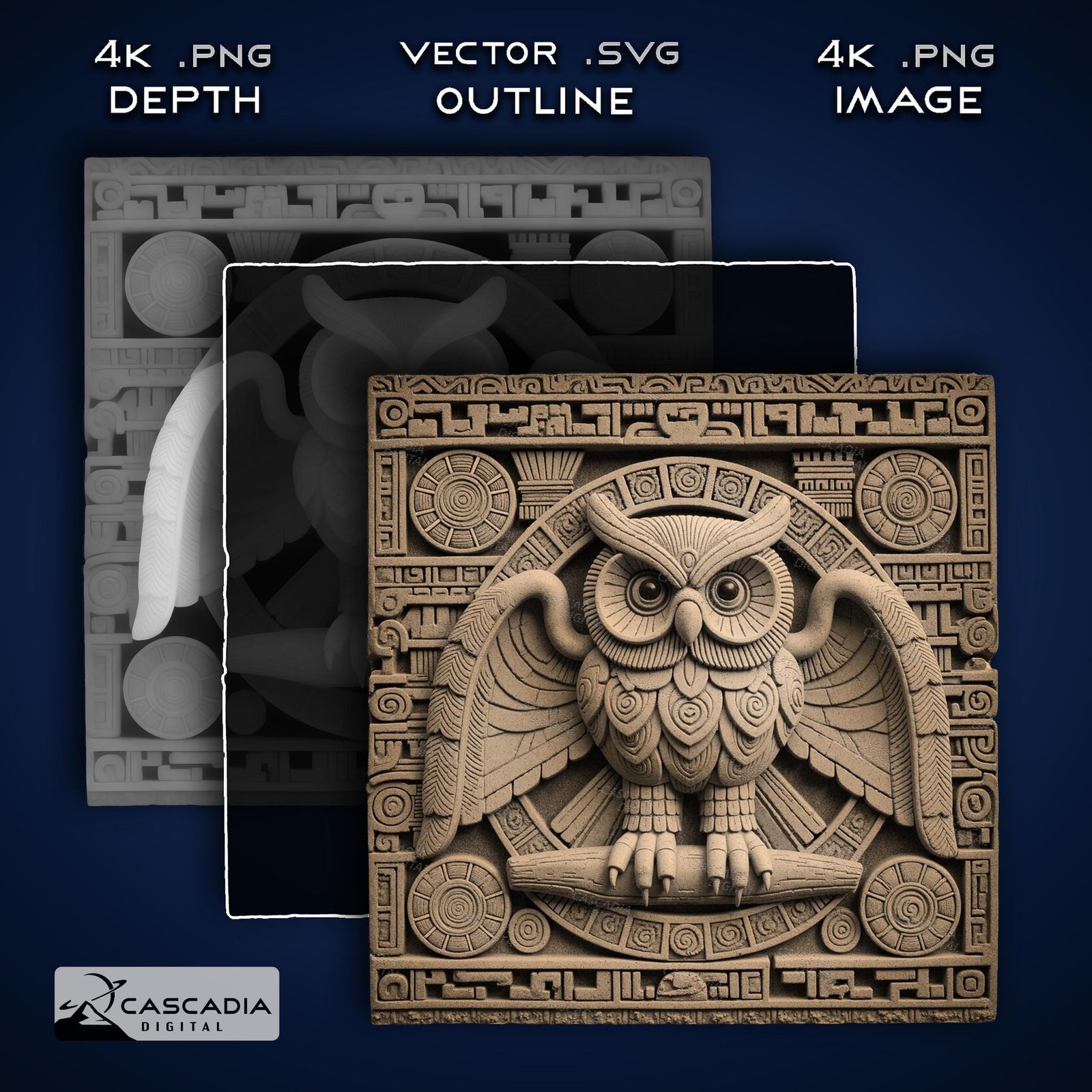Product Description: Owl Aztec – Laser Engrave 4K PNG Image, Depth Map, Exact-Outline Cut File, 3D Illusion