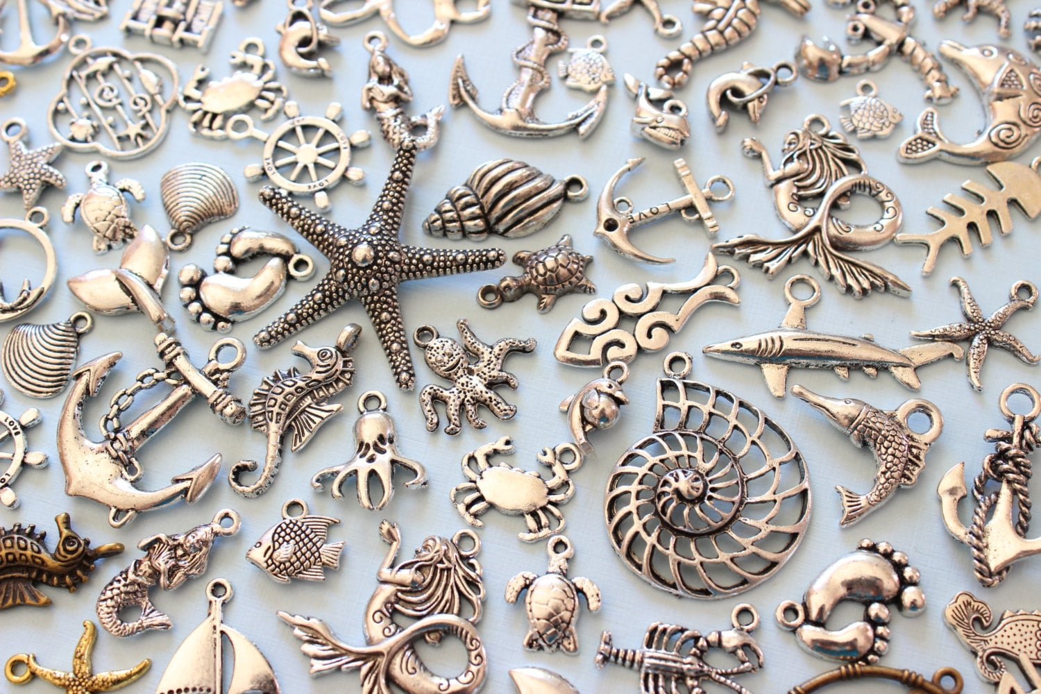 Elevate your jewelry-making projects with this wholesale set of 100+ Ocean Charms in various designs. Whether you are creating a simple necklace or a detailed charm bracelet, these charms are the perfect addition. The majority of the charms are in silver, with a few in antique brass, giving you a mix of styles to work with. Each charm is new and unused, ready to spark your creativity.