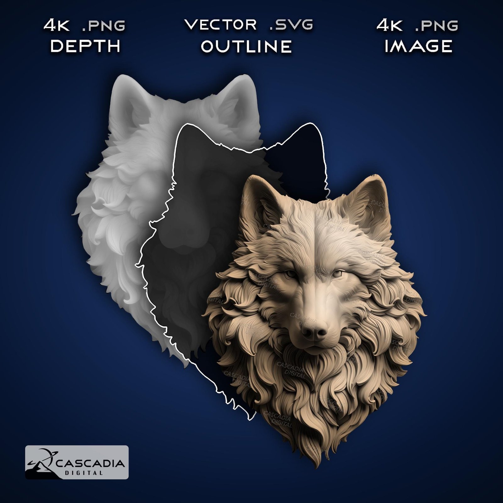 Wolf Head – Laser Engrave 4K PNG Image, Depth Map, Exact-Outline Cut File, 3D Illusion – Animal wildlife nature dog fox kitsune front 1707